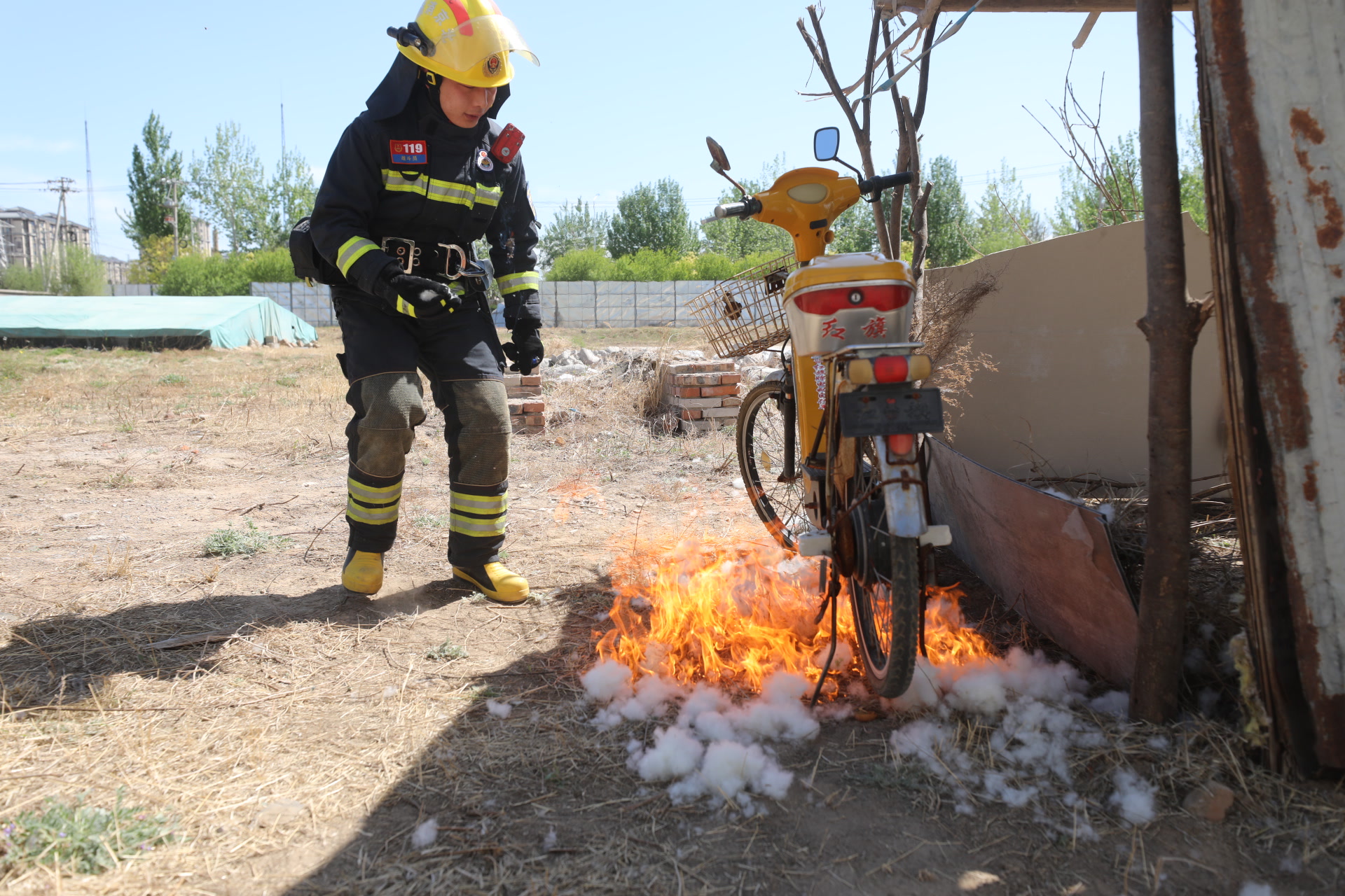 今天上午的實(shí)驗(yàn)安排在大興區(qū)魏善莊消防救援站旁邊的空曠荒地,一輛消防車和幾名消防員嚴(yán)陣以待,水帶鋪設(shè)至實(shí)驗(yàn)場地邊,隨時(shí)出水,以防意外。實(shí)驗(yàn)?zāi)M楊柳絮長時(shí)間堆積不清理,且周邊有雜草、枯枝等可燃物的情況,并將一輛電動自行車放置旁邊——這也是現(xiàn)實(shí)生活一些疏于管理的停車棚的樣子。