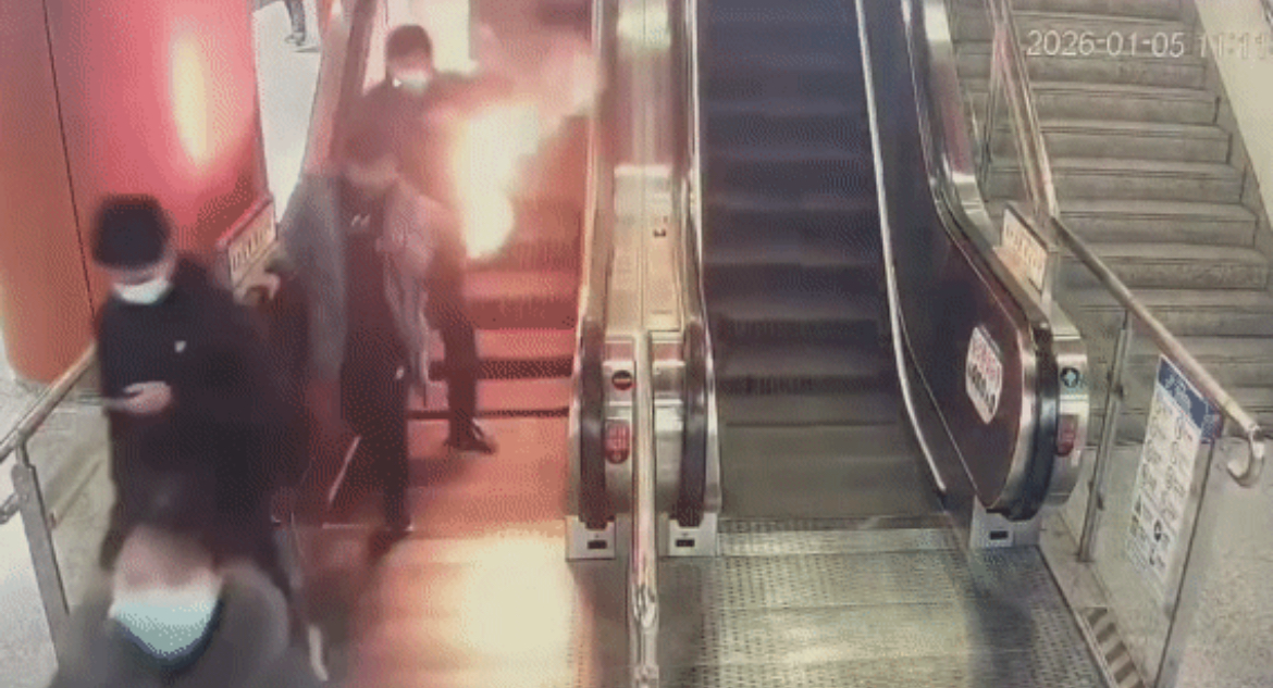 從上海地鐵的監(jiān)控畫面可見,該乘客從站廳層乘手扶梯下行至站臺(tái)層時(shí),其外套一側(cè)已冒出明火。站臺(tái)候車乘客察覺后,迅速向一側(cè)躲避?,F(xiàn)場(chǎng)工作人員發(fā)現(xiàn)后,立即組織應(yīng)急處置,使用滅火器迅速將火撲滅,未影響地鐵正常運(yùn)營秩序。